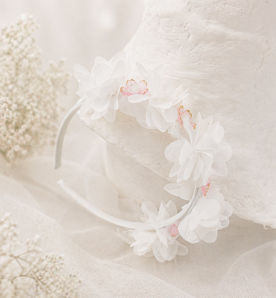 Opaska doskonale komponuje się z klasyczną albą oraz sukienką komunijną. To idealny wybór dla dziewczynek, które marzą o delikatnej, kwiatowej ozdobie we włosach – subtelnej, ale zauważalnej.